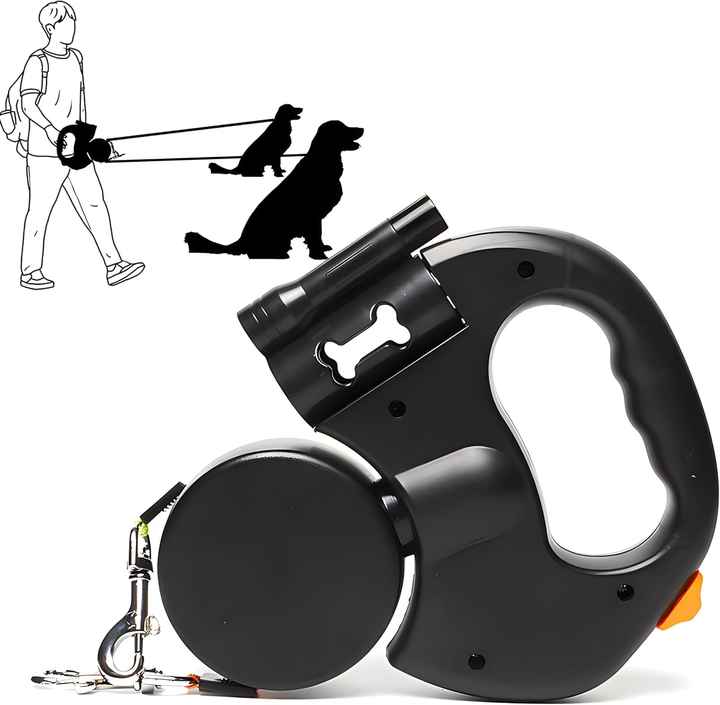 Met de Dubbele Hondenriem wandel je moeiteloos twee honden tegelijk zonder verwarde riemen. De 360º draaikoppeling voorkomt klitten, en het ingebouwde LED-licht zorgt voor veilige wandelingen in het donker. Het ergonomische handvat biedt comfort, terwijl het flexibele koord met automatisch uitschuifmechanisme jouw honden vrijheid geeft zonder de controle te verliezen.